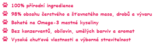 Přírodní vlhké krmivo je kompletní a vyvážené jídlo pro psy všech věkových kategorií. Obsahuje až 98% zvěřiny s vývarem a lososem! Vyrobeno z vysoce kvalitního čerstvého, šťavnatého masa a drobů. Je bohaté na živiny a vysoce stravitelné zdroje živočišných bílkovin.